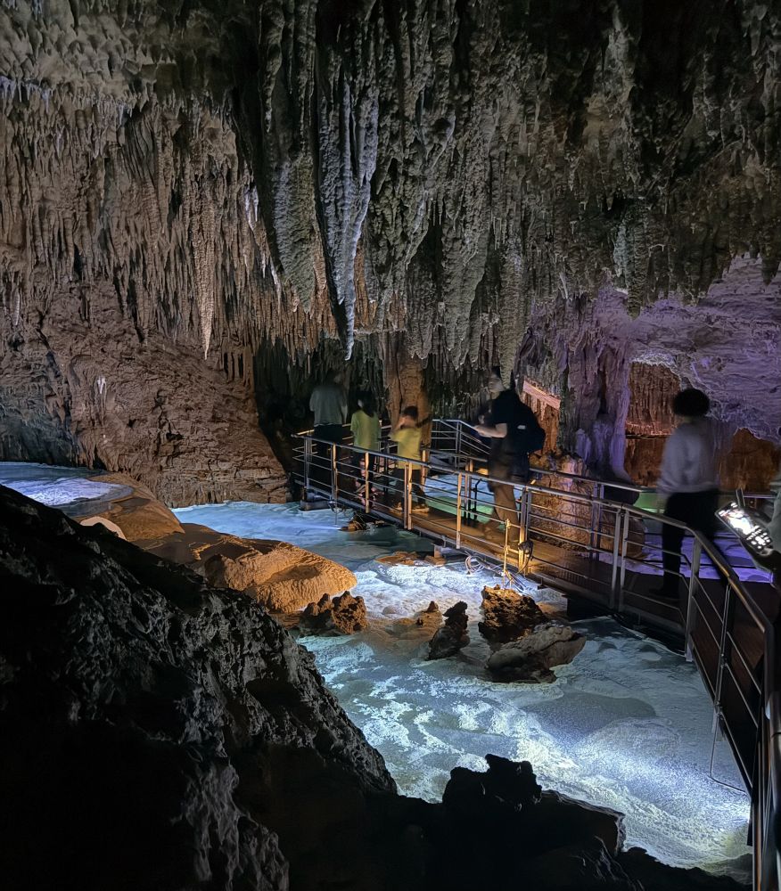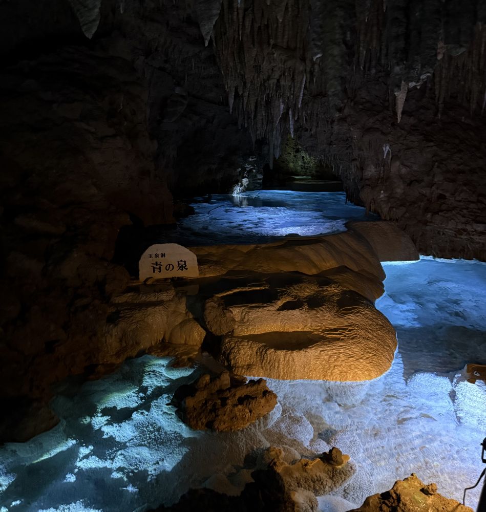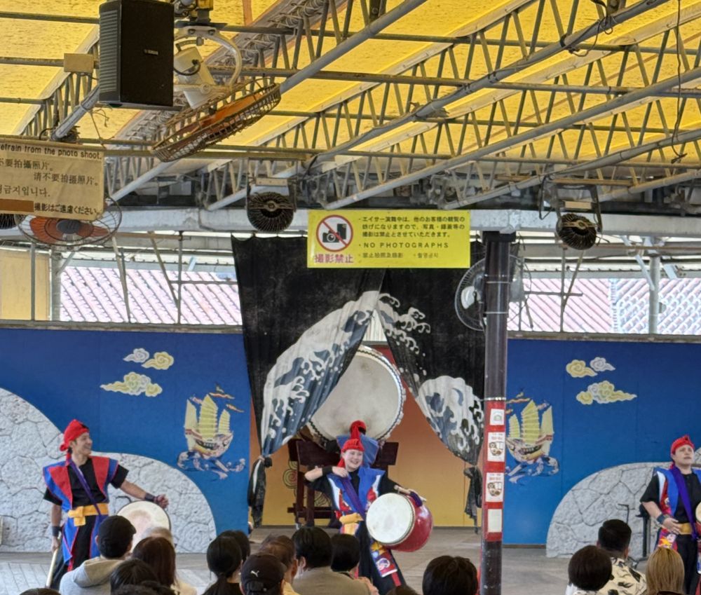 结束观鱼太阳已经高高挂起,我们下一个目的地是冲绳王国文化村。这是本岛南部比较重量级的景点。冲绳王国文化村有一个不错的钟乳石洞窟--玉泉洞。这是个约30万年前形成的石灰岩钟乳洞。全长约5公里,对外开放参观约850米,洞内气温常年保持21–23°C,湿度比较高。在美国我只去过肯塔基的钟乳洞,里面空间很大但钟乳石不算出彩。玉泉洞没有像国内的钟乳洞那样用霓虹灯搞得五颜六色。而是用接近自然的灯光呈现石笋和地下河的本色。冲绳王国文化村还包含琉球王国城下町和传统工艺体验区。如红型染、琉球玻璃、制纸、陶艺和泡盛(冲绳传统蒸馏酒)等受欢迎的活动。不过给我留下深刻印象的还数Eisa太鼓与民俗表演。 Eisa起源于琉球王国时期,原本是盂兰盆节时迎送祖灵、祈福驱邪的仪式。后来发展为集体舞蹈+太鼓演奏。舞者身着头巾和彩色腰带,动作有力节奏感强气势十足。主角是手持三弦琴的领队。她身兼数职不但要弹唱,同时还要领舞。现场与宾客互动也全靠她。据说每个岛每个村都有自己表演队,队服各异。各表演队间还打擂台热闹非凡。可惜本次Eisa太鼓秀不让拍照颇为遗憾。