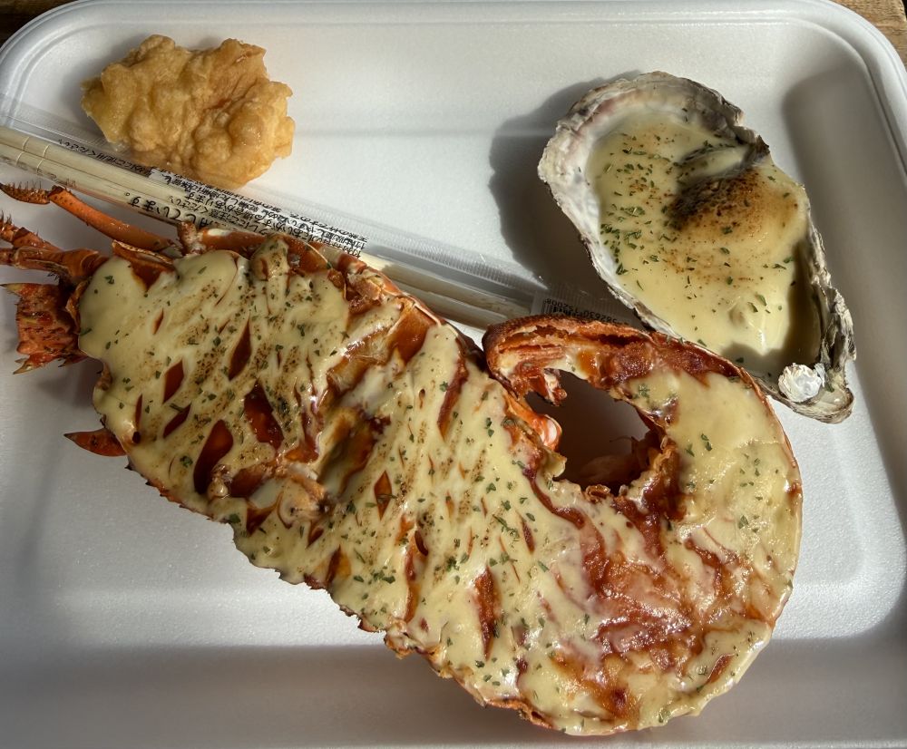结束冲绳世界文化村的参观团员们早已饥肠辘辘。牟导把我们带到糸満漁市場吃午餐。糸满市是冲绳传统渔业重镇。在参观县立博物馆的时候看到糸満渔家都是男人出海捕鱼,女人沿街叫卖的场景。渔市场正是以新鲜海产、价格亲民而出名。我买了伊势龙虾芝士焗。但感觉它的肉质偏老不如波士顿龙虾那样细嫩多汁。队友买的マグロ(金枪鱼)串烧,肉质肥瘦相间入口即化非常不错。