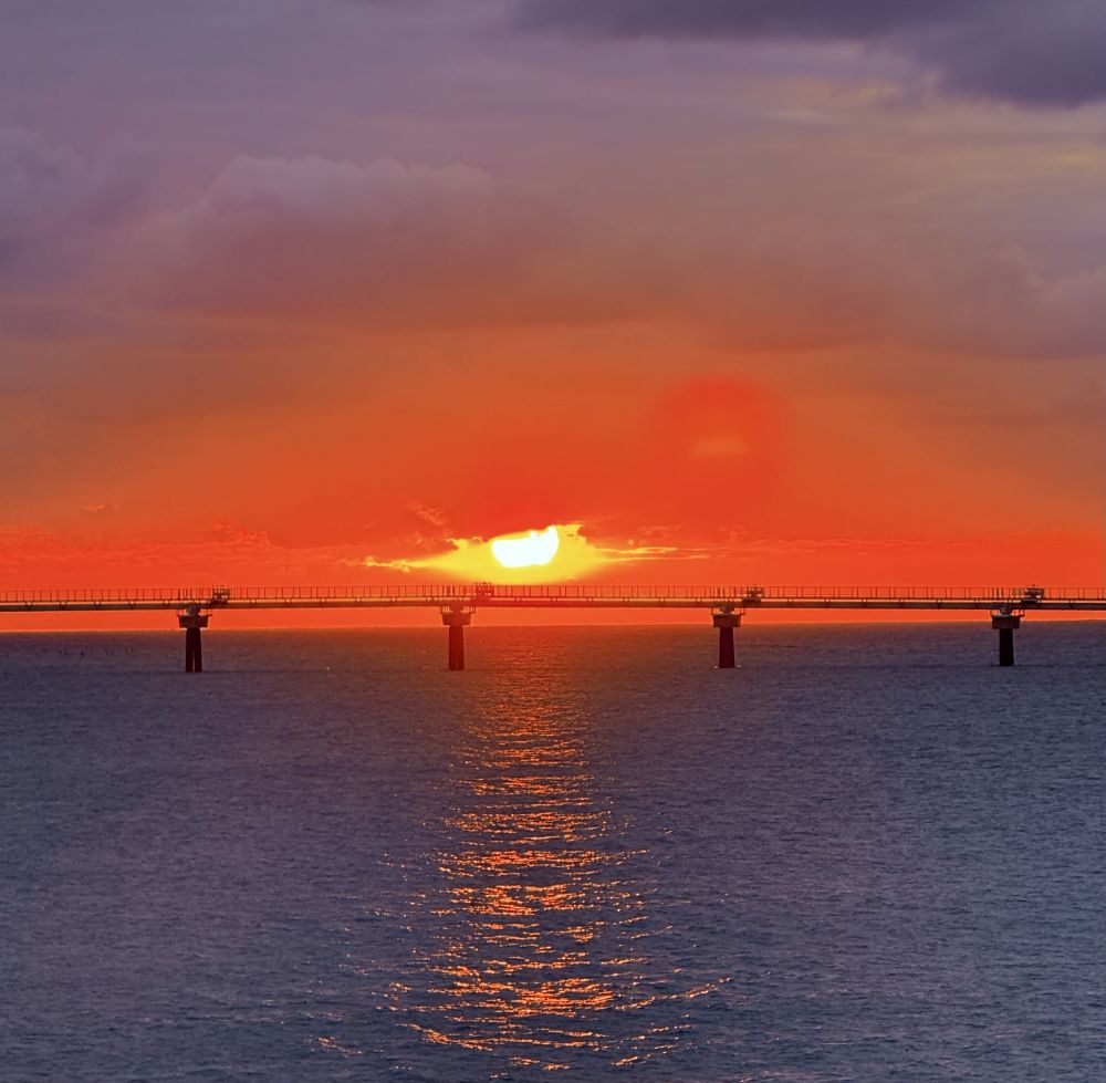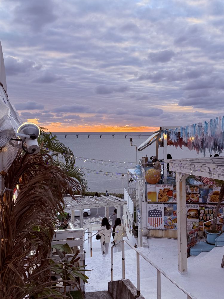 午餐过后旅游车驶入大型购物区以满足游客们的需求。但对我们来说是个无趣的环节。不过看到团友们大包小包满载而归又理解这个安排的重要性。不是还有打飞的到日本购物的吗。一天的时间转瞬即逝日近黄昏我们朝最后一个目的地濑长岛出发。濑长岛位于丰见城市通过跨海公路与本岛相连,紧邻那霸机场,飞机起飞降落时都能看见。 那里的Umikaji Terrace以白色阶梯式建筑群展开。很多咖啡馆、餐厅、甜品店、纪念品店散落其中,有点儿像哪个地中海小镇。我们是为今天的落日而来的。但阳光灿烂了一整天关键时刻却乌云遮天。今日没戏?面朝东海落座发呆。就在大家失望之际随着太阳位置的下降金光越来越强太阳最后竟露出了脸。好美的夕阳!我曾在意大利五渔岛有过追赶落日的经历。“乌云遮不住太阳!”学习坚守和不放弃!濑长岛的夕阳为我们冲绳本岛南部游画上了完美的句号!