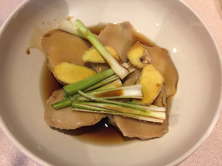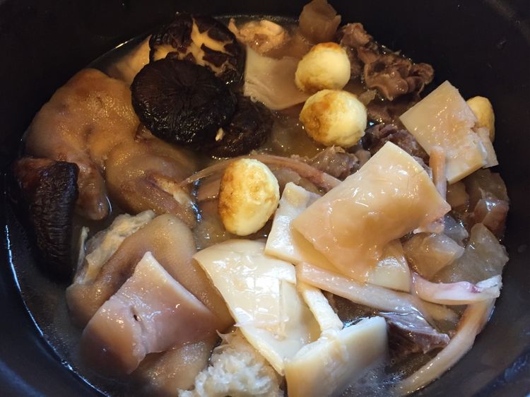 真正的大肉来了:鸡鸭兼猪蹄。看似主角,最后都成了陪衬,鲜味进了其他材料,本身并不惊艳。老公说法是鸭肉猪蹄宜浓油赤酱笃,佛跳墙里不放老抽,没有本帮菜入味。但是蚝油和冰糖溶在绍酒里,倒有日本味醂风味,稍近关东煮,所以蔬菜,尤其是萝卜和香菇味道最佳。