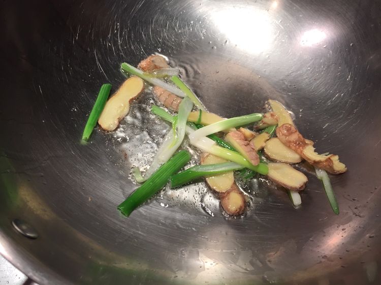 具体做法,锅里放油爆香葱姜,葱姜捞出备用,一部分葱油也备用。
