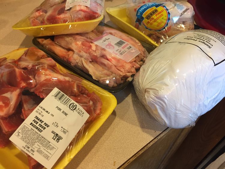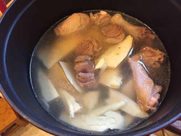 我还买了只加拿大的龙岗鸡,砍下些没肉不中吃的部件炖了鸡汤,这样汤底就全活了。