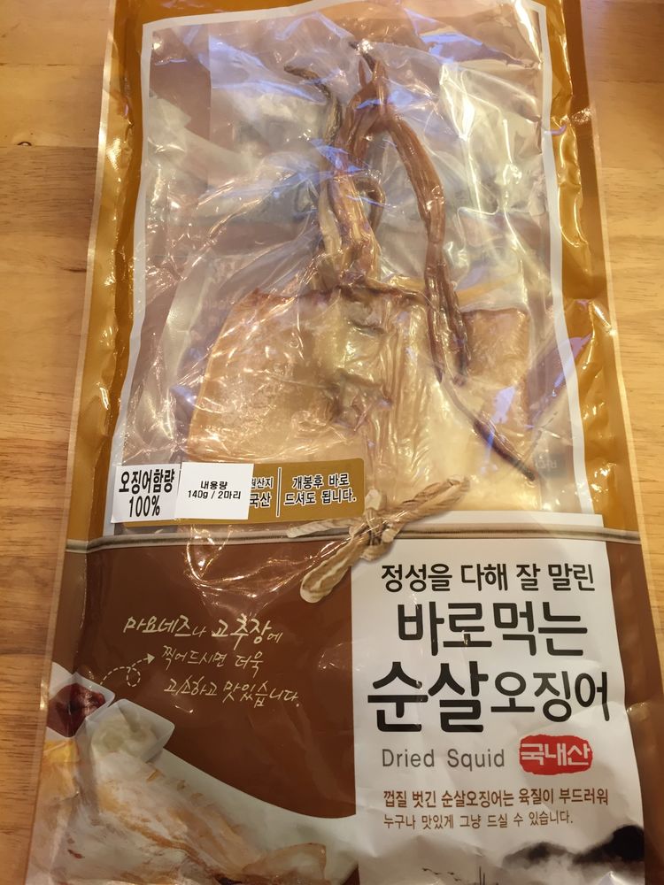 韩国店买的鱿鱼干很干净,但是说明都是韩文,我看图琢磨,难道是在微波炉里加热的?实在匪夷所思。我还是用传统方法,温水泡半天,1:20碱水浸三四个小时,然后反复冲洗漂净。天气很冷,手指着实不好过。