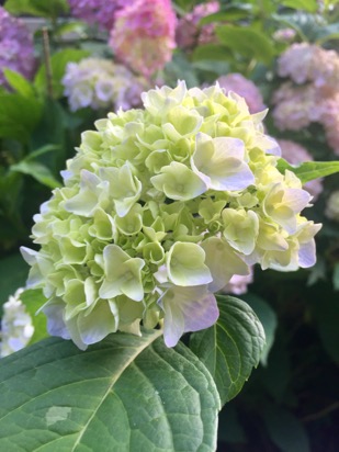 又,家里的变色绣球开得正好。粉、蓝、紫,大朵大朵的,各有千秋。可我还是最喜欢初开时的浅绿色。