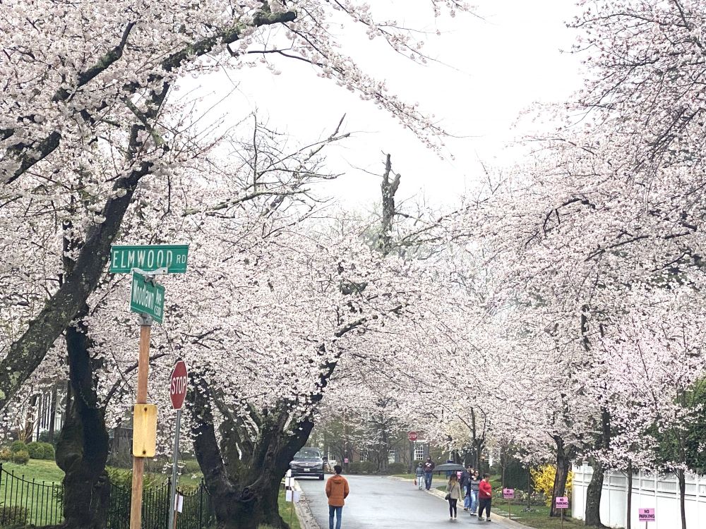最近天气越来越暖和,开始进入一年当中最美的季节。真正是阳春三月,鸟语花香。我家门前的樱花和梨花一夜之间开了满树的花,我忍不住天天出去走路赏花。当然,说到樱花,美国首都DC潮汐湖的樱花这个周末正是高峰期,天天有近百万的人来赏花。我们当然也去了。可惜去的时候完全找不到停车位,没办法,就转到另一个也是以樱花著名的小区看花。