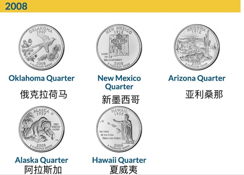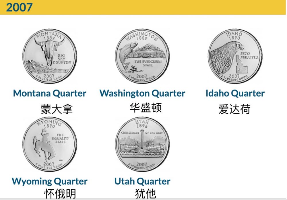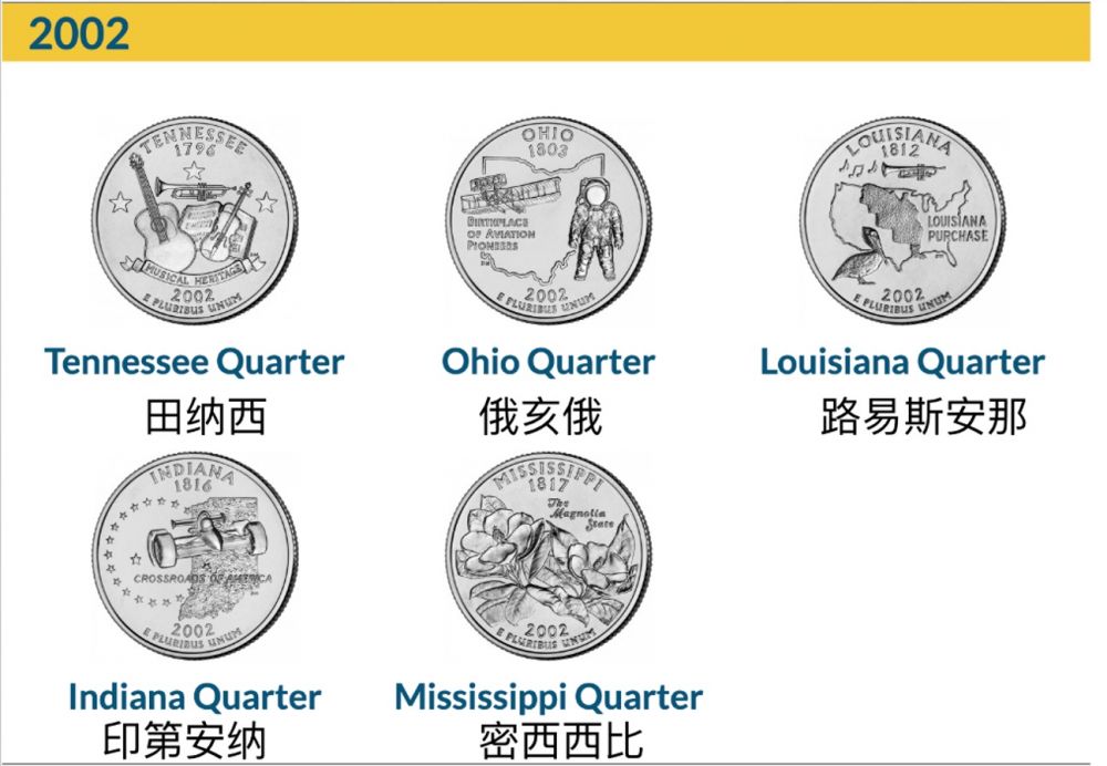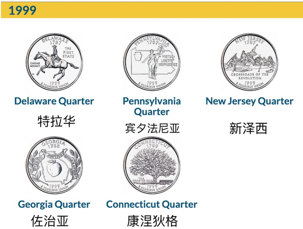 “州Quarter”是由克林顿总统签署,在1999年开始发行的。按照各州加入联邦的顺序,每年发行5个州的, 也就是5枚,到2009年才全部发行完毕。第一个是特拉华州,最后一个是夏威夷州。这种Quarter的正面还是华盛顿总统的头像,背面则是代表各个州独特的历史、地理、传统、资源、或名人。背面图案的设计,是由各州自行决定的。因为这个,还掀起了一场民间的设计大赛。凡是想参与的人都可以提交自己的设计,然后州政府评选出最好的一个,最后由各州州长和财政部审批后定案。发行这套Quarter的目的,是希望通过这种方式,让年轻一代了解各州的人文历史等等。我想,他们的目的是达到了的。不光是美国本土的年轻人,就连我们这样的外国人,也通过使用这种硬币,很直观地了解了那个州最具有代表的特色。