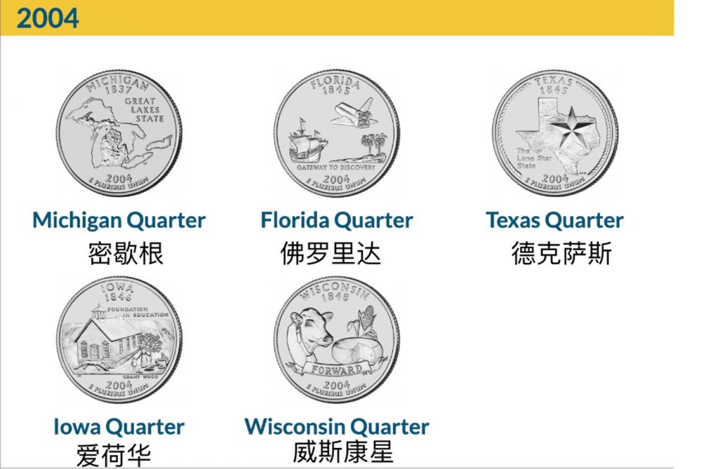 一般而言,除了极少数的,每枚州Quarter上都有文字,用来说明图案或本州特色,如密歇根州的是“Great Lakes State”,意思是“大湖之州”,因为它就在五大湖边儿上;内华达州的是“The Silver State”,白银之州,因为那里盛产白银。也有的州刻了本州的铭言,比如宾夕法尼亚州的信条是“美德、自由、独立”。佐治亚州的则是“智慧、正义、中庸”等等。不过,就文字而言,我自己最喜欢的是新罕布什尔州的“Live free or die”——“不自由,毋宁死”。