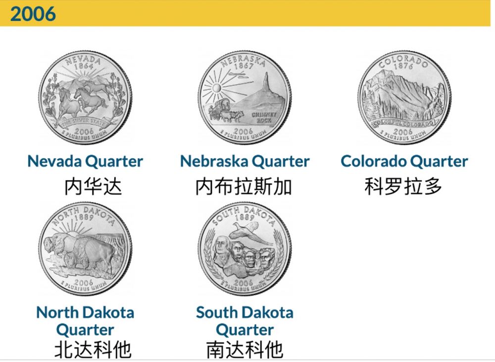 ——第三:地理及特产。这一类是最多的,图案的设计大多也都很复杂繁琐,信息量很大。比如华盛顿州的鲑鱼和瑞尼尔山,科罗拉多州的洛矶山,内布拉斯加州的烟囱石,内华达州的野马和山艾树,堪萨斯州的北美野牛和向日葵,阿肯色州的钻石、稻米、和野鸭,密西西比州盛开的木兰花,佛蒙特州的枫树和收枫汁的桶,新罕布什尔州的老人岩、阿拉斯加州的北极熊,南达科他州雕有总统头像的拉什莫尔山,亚利桑那大峡谷,俄勒冈的火山口公园,还有肯塔基州的牧场和种马等等。