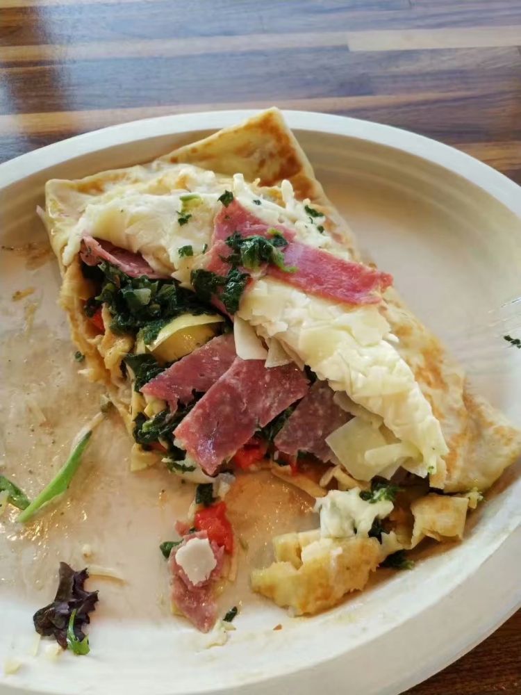 今晚来到是South Lamar上一家做可丽饼的新式欧洲餐厅Crepe Crazy。这家店子正宗程度绝对是毋庸置疑的,因为所有店员全是英语比我还差的法国人…所以点菜基本上是靠手指外加眼神交流。点了一份本月特色的意式可丽饼。饼做的不错,面皮金黄纤薄,火候恰到好处,口感松软,奶香浓郁。中间夹的食材都是欧洲用料,什么火腿、奶酪、酸笋、红椒、菠菜,很像我二导师做菜的口味,体验马马虎虎。如果下次再来的话,我应该会点甜口,而不会再点咸口了,毕竟甜点才是西方特长所在。