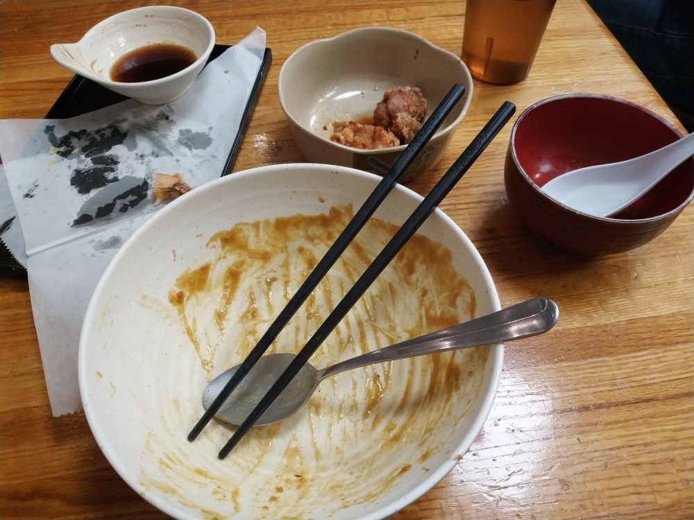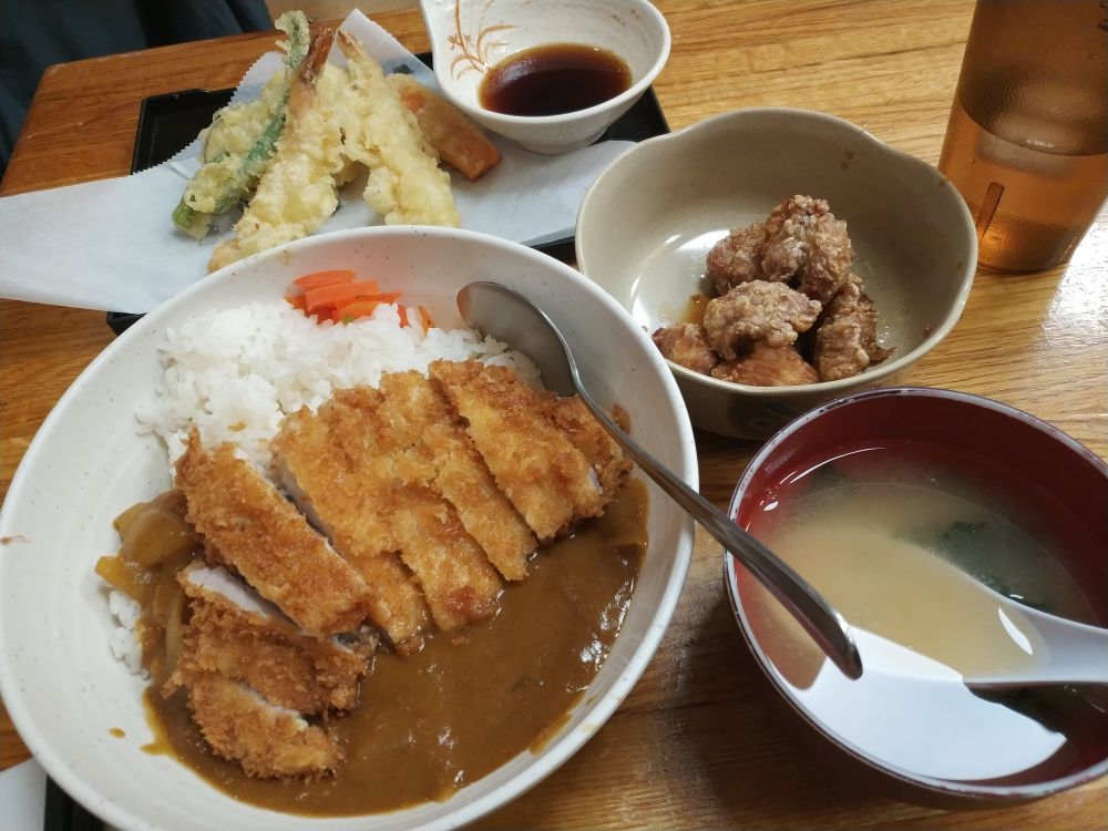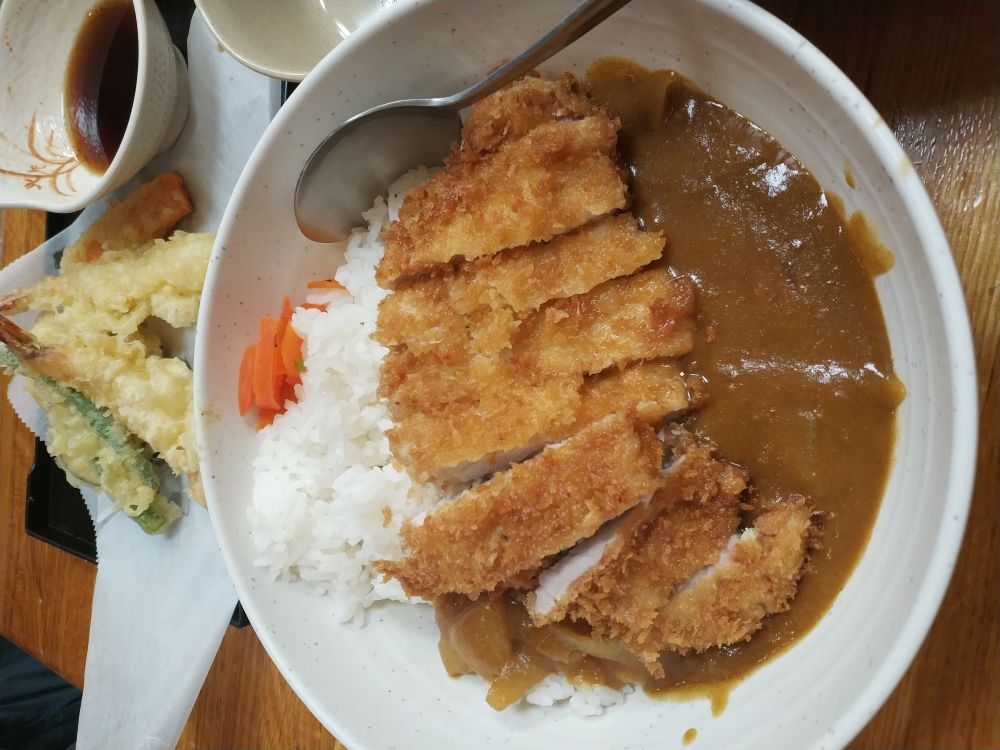 因为每家餐馆我只走马观花似的体验一次,所以我就把它家代表性的菜品全点了,一份炸猪排咖喱饭,一份日式唐扬炸鸡,一份天妇罗炸虾。