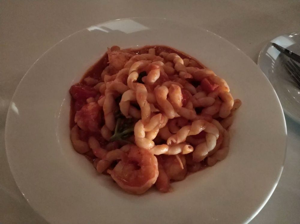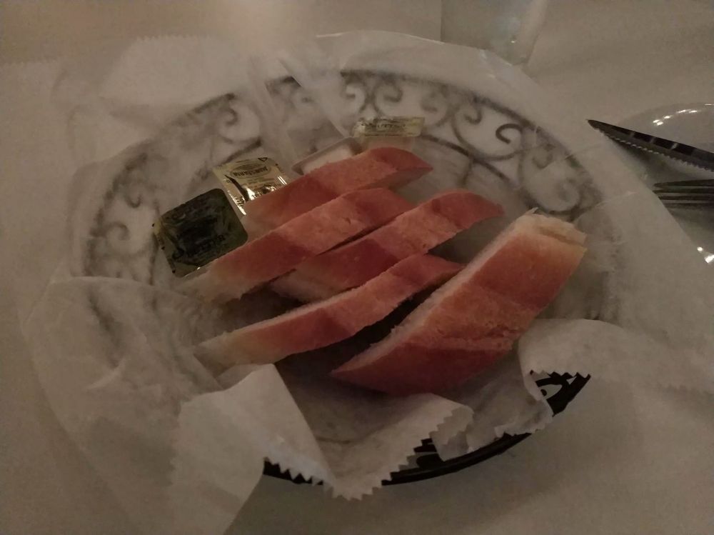 这段小插曲告一段落以后,我找了外边一张桌子坐下,准备点菜。因为它家没菜单,所以点菜全靠服务员报菜名。一堆拉丁词汇连珠炮似的从服务员嘴里喷出来,到最后我只听懂俩词儿,“Shrimp”“Pasta”,于是乎便成了今晚的主餐--虾仁意面。餐前按规矩上了点面包,很一般,低于正常西餐厅平均水准,没有蒜味,没配橄榄油,只配了低端黄油。约十分钟以后,面上来了。虾本身无话可说,但面做得十分地道,煮的火候拿捏得还好,不软不硬。吃起来有几分劲道,超市买的意面与之根本无法与之相提并论,反倒还真有些像原来我奶奶常做的面疙瘩。除了虾和面以外,佐料运用简单而节制,只有一瓣蒜,三片九层塔,几个圣女果和番茄酱,但味道搭配得很好,主次分明,突出一个红酱的味道,没有让香料喧宾夺主。吃起来很舒服。