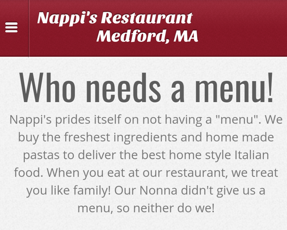 今晚来打卡的是Medford一家名为Nappi's restaurant的意大利餐馆。他们家的最大特色就像前几天曝光的厉家菜一样--没菜单!给出的理由是像你奶奶一样给你做意大利家常菜,你奶奶给你做菜的时候难道会上菜单吗?我想说我奶奶这辈子压根就不知道意大利菜是啥,更别说做了…故弄玄虚玩这种套路的餐厅我也不是头回见。它们就像婚恋网站上照片放风景或宠物的姑娘,要么惊艳,要么吓人。凭我的经验来看,百分之九十九是后者,左划准没错。不过他家评分奇高,我还是来碰碰运气。