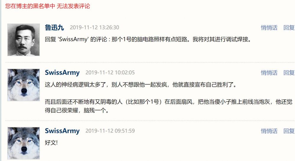 》呵呵,我现在的确是看着真鲁迅的样子,我也看着难受了。全都是他打着鲁迅的幌子,糟蹋了鲁迅的英名。但是,他的东西我还得耐着性子看,要看他在胡说什么。不然的话他要挑衅,我就没有埋汰他的根据。