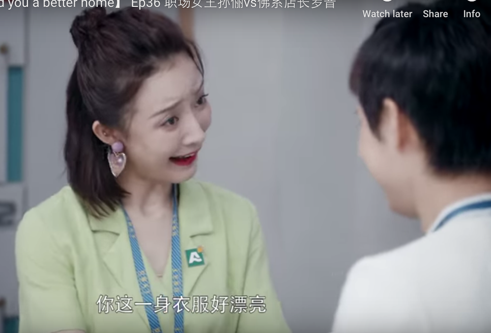 剧里让我印象特别深刻的是一个小插曲:店长房似锦为了迎接老洋房客户宋爷爷和江奶奶,特意把自己打扮了一下。朱闪闪手里拿着茶杯经过,看到后,马上睁大了眼睛,张大了嘴,“嗷”了一声,一路碎步快速跑到房似锦面前,放下茶杯,满面春风地拉起房似锦的胳膊,“房店长,让我看看”,仔细打量起来,脸上洋溢着青春的笑容。“房店长,你这身衣服好漂亮啊!嗷!鞋子也是新买的,款式是最新的,bling-bling的。”房似锦有点局促不安,说“我今天要见老洋房的客户,所以穿得正式了点。我一会儿要在会议室见他们,你帮我收拾一下。”闪闪答道:“好的呀!好的呀!”。拿起茶杯转身去会议室时,又转回头,开心对房似锦说:“好看!”。我难以挖掘深层次的内涵,只是想说:这小姑娘,太可爱啦!你没有觉得她是在演,那种惊喜,那种为他人开心的心态,是那么地自然流露。
