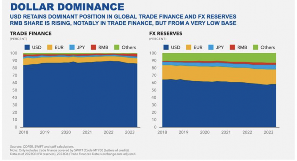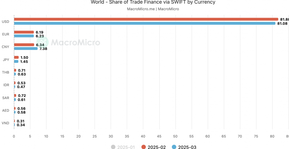 美国之所以会倾向不守规矩,一个重要原因就是它拥有的超凡能力。尽管几十年来悲观论者不断看衰美国,但美国的实力依然强大。美国的消费市场规模几乎是中国大陆和欧元区市场的总和。全球一半的贸易和近90%的金融交易均以美元结算,并通过与美国有关联的银行进行,这赋予了华盛顿实施制裁的权力(下图 IMF/MacroMicro)。与人们普遍看法相异且颇具讽刺意义的是,美国却是世界上贸易依赖程度最低的经济体之一:出口仅占GDP的11%(其中三分之一销往加拿大和墨西哥),而全球平均水平为30%。美国公司提供了全球一半的风险投资,主导着能源和食品等生活必需品的生产,并在包括半导体、航空航天和生物技术在内的高科技行业创造了全球一半以上的利润 - 几乎是中国大陆获得利润的十倍。美国依赖中国大陆提供诸如基础化学品、仿制药、稀土和低端芯片这类商品,同时中国大陆只能从美国及其盟友那儿获得高端技术,以及可靠的粮食和能源。因此,一旦美中关系破裂,双方都会受损,中国大陆可能损失更大。