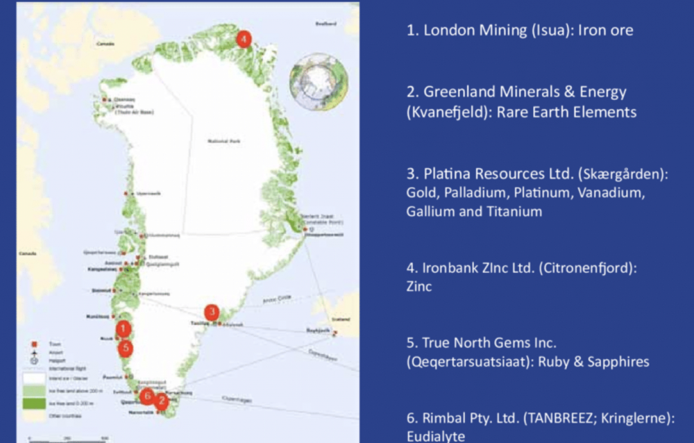 随着政策制定者努力应对全球变暖的后果,一些现在看起来厚颜无耻和荒诞不经的事情在未来几十年可能会变得屡见不鲜且习以为常。对于一个希望在气候变化的世界中取得成功的大国来说,得到格陵兰岛有很多的好处。随着北极冰层的融化,这座巨大的岛屿可能会成为北方新航线的重要航点。气候变暖使人们可以勘探格陵兰岛地下的矿床 - 科学家们认为,格陵兰岛可能拥有大量的铁矿石、铅、金、稀土元素、铀、石油和其他宝贵资源,包括清洁能源转型所需的矿物(下图 reddit/ResearchGate)。