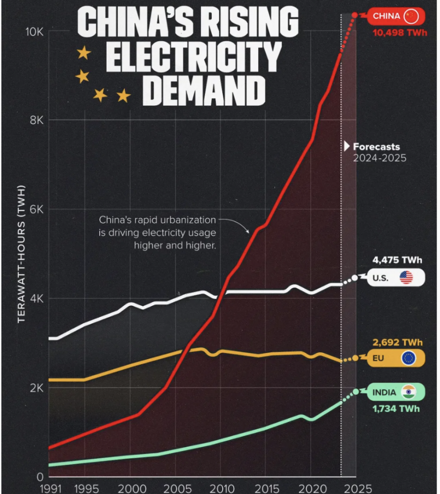 电网是中国大陆实力雄厚的另一关键基础设施系统。过去二十五年,大陆在发电厂建设方面处于世界领先地位,每年新增发电量相当于英国的总发电量。如今,大陆年发电量超过了美国和欧盟之和(下图 facebook/voronoi)。大陆独有的特高压输电线路能够高效远距离输送电力,同时还拥有各类电池储能系统。充足的电力供应推动了大陆电力依赖型交通系统的快速发展,例如高铁和电动汽车。由于已经克服了长期以来阻碍电力成为世界主要能源、取代化石燃料直接燃烧的障碍:电力难以运输、难以储存,且作为交通燃料的燃料效率低下等,中国大陆正稳步迈向成为世界上第一个主要依靠电力驱动的经济体。电力占全球能源消耗的21%,占美国能源消耗的22%,占中国大陆近30%的能源消耗。而且这一比例还在快速增长:每年约6%。大陆的