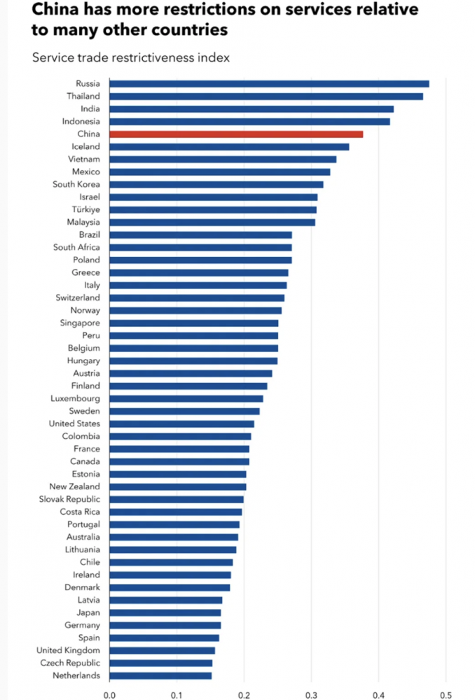 如果说中国大陆对科技和制造业企业过于慷慨,那么北京对服务业就有些监管过度了(下图 voronoi)。如大陆一直都严厉打击那些被政府视为存在垄断行为或威胁政治或社会稳定的互联网公司。北京还严格控制金融、医疗和教育。结果,这些行业的就业增长一直疲软。要知道服务业也吸纳了中国大陆约60%的城镇劳动力,并且在过去十年中贡献了全部的净就业岗位。服务业的监管过度使大陆整体的就业增长受到了巨大冲击。由于就业机会难找、工资涨幅微乎其微甚至毫无增长,以及房价下跌,大陆消费者变得不愿消费。而私营企业也因通货紧缩需求疲软,不愿招聘员工或提高工资。