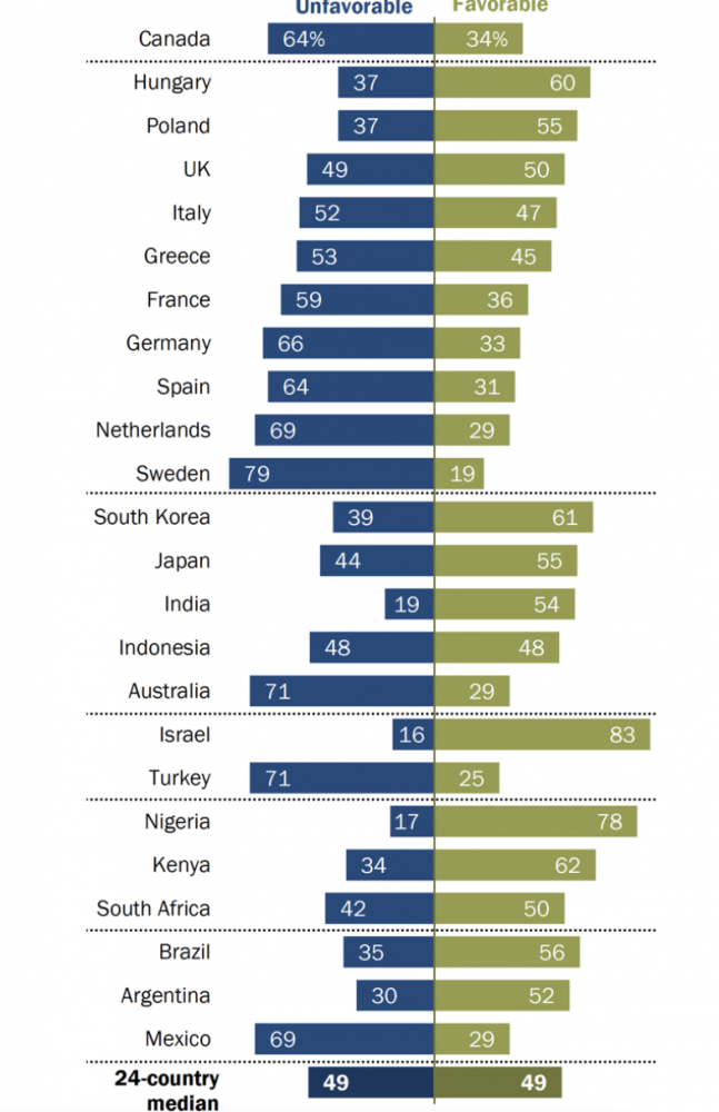 川普政府预计其关键盟友会不惜一切代价寻求美国的保护,日本、墨西哥、菲律宾和英国采取的策略与川普政府的预期最为接近。短期内,这些国家已决定,无论付出何种代价,其命运都必须掌握在美国手中。但川普低估了盟友的感受 - 与美国的亲密关系带来的只是华盛顿令人不解的背叛。美国的受欢迎程度急剧下降:皮尤研究中心2025年春季关于对美态度的调查显示,对美国持好感的日本公民比例较上年下降了15个百分点;加拿大人对美国的好感度下降了20个百分点,墨西哥人对美国的好感度下降了32个百分点。这种巨大的负面转变反映出一种让真心投入到美日关系中的人倍感失望和寒心(下图 Pew Research Center/Newsweek)。