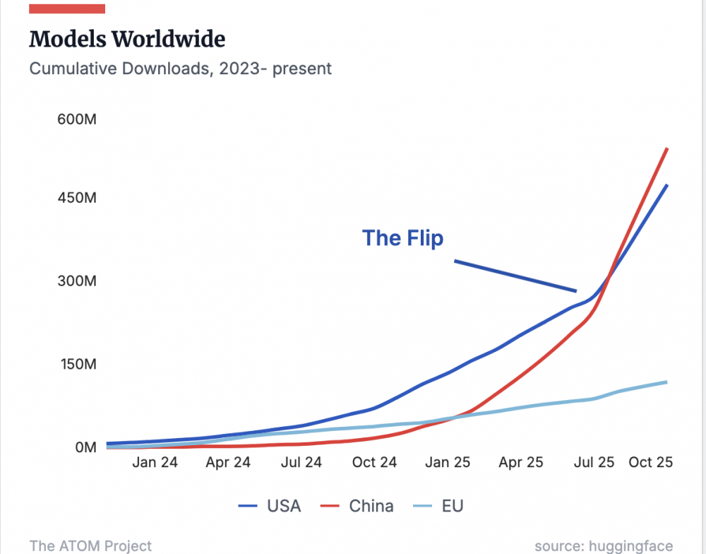 为促进美国开放模型的发展而创立了Atom项目的机器学习研究员兰伯特(Nathan Lambert)表示,这些公开的例子只是“冰山一角”。兰伯特告诉半岛电视台(ALJAZZERA):“中国开源模型已经成为美国初创企业的实际标准。” 兰伯特说:“我个人听说过很多其他备受瞩目的案例,那些估值最高、最受追捧的美国人工智能初创公司都在使用Qwen(阿里巴巴)、Kimi(月之暗面)、GLM(中国智谱)或DeepSeek(深度求索)等平台来训练模型。” 他还补充道,许多美国公司一直不愿公开披露他们使用中国大陆技术的情况。虽然无法精确量化不同人工智能模型的使用情况,但有一点是确定无疑的:中国大陆人工智能产品正日益受到欢迎。据连接开发者和人工智能模型的大模型API聚合平台 OpenRouter 的数据显示,在10月的最后一周使用量最高的20个AI模型中,有7个是大陆人工智能工具,包括 MiniMax(上海希宇)的 M2、Z.ai(中国智谱)的 GLM 4.6 和 DeepSeek(深度求索)的 V3.2。OpenRouter 的数据显示,在用于编程的前10个模型中,有4个是由大陆AI公司开发的。根据 Atom Project 对托管平台 Hugging Face 数据的分析,截至10月,大陆开源模型的累计下载量已超过5.4亿次(下图 AtomProject)。专注向硅谷介绍大陆创新的英文播客Tech Buzz China创始人马睿表示,大陆模型对初创企业尤其具有吸引力。“这些通常是成本意识很强的早期公司,它们会进行广泛的实验,”。