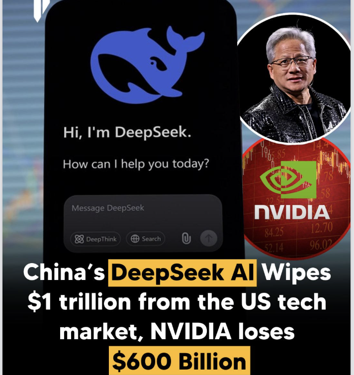 说到这里,笔者不由些许感概。2022年11月30日,OpenAI发布ChatGPT时,中国大陆的人工智能工程师称之为他们的“ChatGPT时刻”,仿如美国人称1950年代苏联卫星上天的“斯普特尼克时刻”(Sputnik moment)。对许多从事AI的大陆人来说,那是一段相当煎熬的时期。可2024年5月大陆杭州的深度求索发布开源模型DeepSeekV2, 尤其是2025年1月推出DeepSeek R1时,的确是对美国人的一记“当头棒喝”- 其在低阶芯片跑出性能堪比美国顶级大模型的效果且运行成本低廉。最直观的反应,便是英伟达的股价跌跌不休 – 堪称美国人的“DeepSeek moment”(下图 Youtube/facebook)。