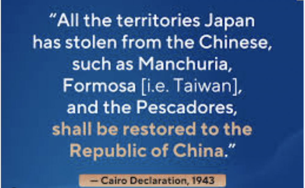1911年清朝灭亡后,台湾仍然处于日本的控制之下,中国进入军阀割据时期。1928年,国民党名义上统一了中国,建立了中华民国。包括美国(1928年)和英国(1935年)在内的主要西方国家承认中华民国是全中国的合法统治者。在1943年的开罗会议上,中华民国领导人蒋介石、美国总统罗斯福和英国首相丘吉尔发表联合声明,明确指出“日本从中国窃取的所有领土,例如满洲、福尔摩沙(即台湾)和澎湖列岛,都应归还中华民国。”(下图 X/360Doc.)1945年日本投降后,中华民国收复了对台湾的主权,史称“光复”,意为“光荣地收回失地”。