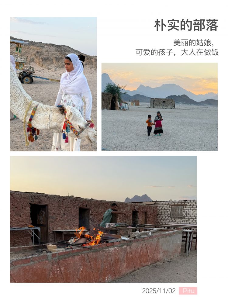 后来,我们乘车来到红海沙漠中的一个小村,了解埃及少数民族“贝都因民族”。眼前,破旧的土坯房,和质朴的村民及孩子,让人心生怜悯,当地的厕所,又脏又臭,都不敢用;厨房也是最简陋的,我们来这儿是被安排看红海沙滩,然后,去这小村骑骆驼,还要在村里吃一顿饭,大家心里都明白,除了看自然原生态风光,真没兴趣吃当地的饭(据说有特色),这卫生条件,真不敢大吃。这趟旅程每人$70 美金,大家全当扶贫了。没见海,沙滩显荒凉。骑骆驼,喂骆驼,挺有趣,当地的姑娘真美丽!(图)