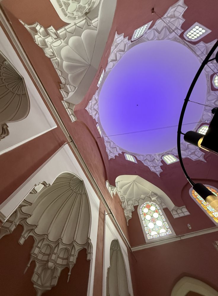 当我步入清真寺室内,更是别有洞天的感觉。不由得被穹顶的设计与绘画所震撼。仰起的头便舍不得低下,边走边看,目不暇接,美不胜收。