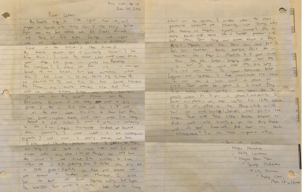 1个多月前,安迪结束了最后几门AP考试,高中阶段的所有考试就结束了,然后再过1周多就是高中毕业典礼了。就在那个周六的晚上,安迪突然高兴地大叫起来,原来他的初中一年级老师给他寄来了6年前2016年6月1日儿童节时安迪写给未来自己的信(Future Letter)。