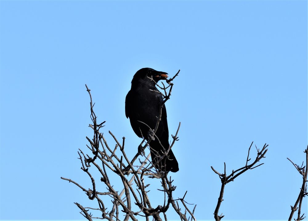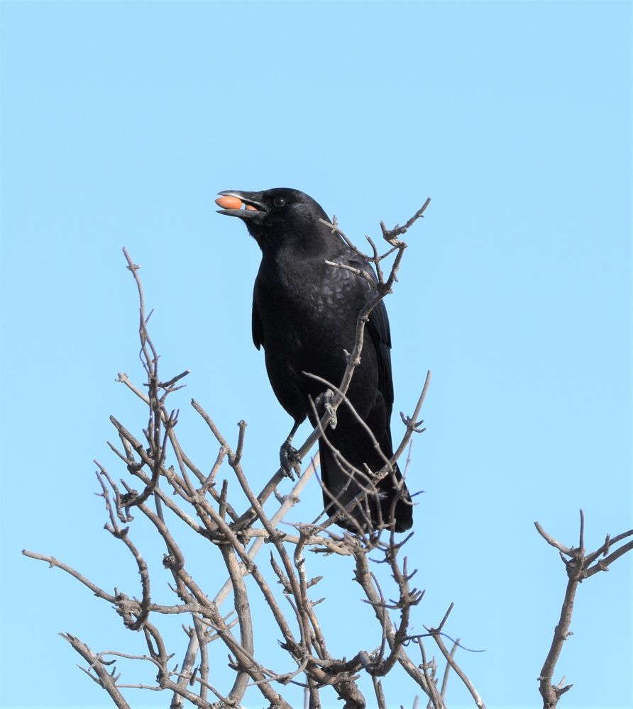 乌鸦黑不溜秋,绝对不是打鸟人的目标,我也不例外。偶尔打一个,却有意外发现。打鸟的湖边没有什么橡树,这只乌鸦,口里含着两棵橡树果子,不知是冬贮还是要带回家喂宝宝。不知还要含了多久?家在什么地方?