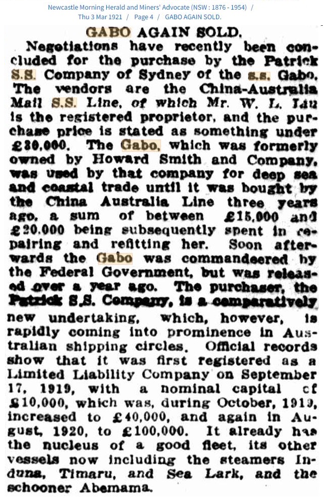 該次運貨回香港後,於11月23日離開香港返航雪梨。到1920年1月24日在紐卡素Newcastle與雪梨之間發覺鍋爐管泄漏,急忙駛回庇厘時彬Brisbane維修,停留10多小時後續航(“Engine Trouble on the Gabo”: Sydney Morning Herald”, 27 Jan, 1920. Page 6)。