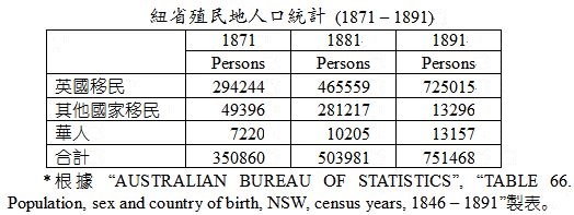 一直以來有一個誤解,華人在淘金潮退後就蹍轉到城市謀生。但從紐省的人口統計數據看又似乎不對。1881年時雪梨華人為1321人,到1891年則有3500人,而在下表中可見這10年間紐省華人的增加也是接近2000人,也就是說紐省其中城鄉的華人數量並沒有太大的變化。