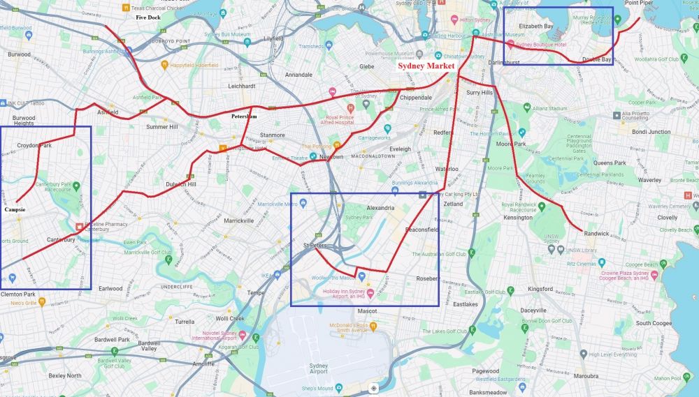 雪梨西面方向的菜農在Croydon Park和Campsie一帶靠Cook River邊的低窪地區,此處在歷史上一有暴雨就水浸。在Croydon Park比較集中的有100人,曾有基督教華人牧師前往宣道。從這一方向運菜蔬到雪梨市場出售的並不完全是華人,“至少有70車蔬菜”經Parramatta Road往市區只是有可能耽誤了出售的時機,堵的原因是Parramatta Road是西區往市區最寬及最方便的主干道。Petersham幾乎是并線的地區,故往往堵得利害。