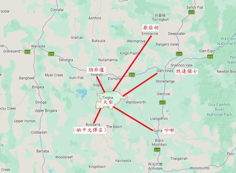 图中除了Bundarra在历来收集的中文译名没有外,其余均为早期华人的淘金地或聚居的商业市镇,与天架华人的关系在以后说明。Bundarra没有中名译名是有点奇怪的,因为在1900年到1907年间与天架共享一份地方报纸“Bundarra and Tingha Advocate”。翻查这份报纸,除上述年份外,后来则改为“Bundarra Advocate”了。即使在前后报纸的报导中基本没有华人的信息,然若干年份有华商的广告,包括“永兴隆”在内。