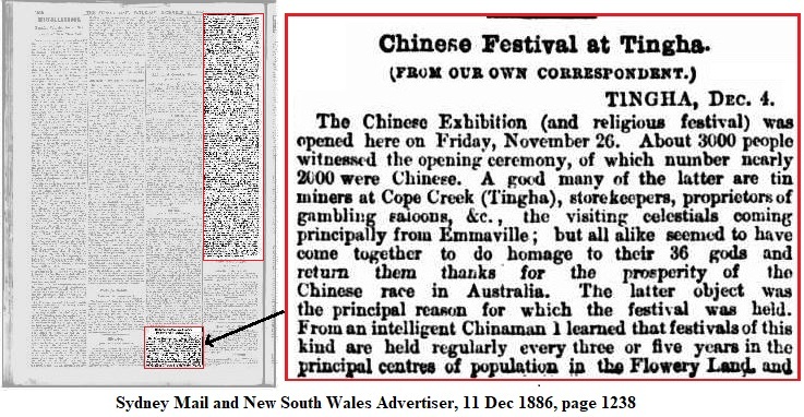 “雪梨邮件及新南威尔士广告报”Sydney Mail and New South Wales Advertiser在该页以“天架的华人节日Chinese Festival at Tingha”来报导天架华人的一次活动。
