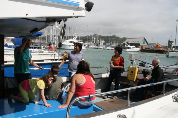 大家在讨论游泳的细节问题。例如游泳前吃什么,水中吃什么,怎么吃,什么时间下水,在哪里下水,在哪里上岸,规矩多得很。船长说,根据预报,8号左右天气海况转好,预期可以下水,大家等待着。穿红背心的女士叫三姆(sam)她曾成功游渡海峡,也是奥林匹克火炬手之一。这次她将作为认证员随船同行。穿绿衣服的是船长。