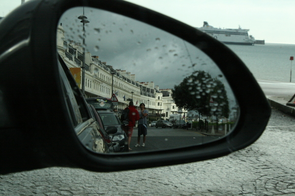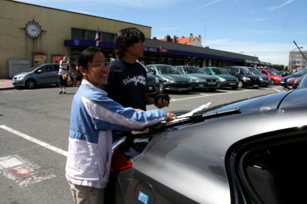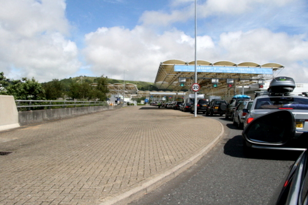8月5日 今天的计划是到对岸的法国。大田的一个朋友正在欧洲旅游,听说横渡的事,赶过来帮忙,今天到达法国的卡莱,我们去接她。同时去认认横渡登岸的地方。 开车去对岸法国要到多佛穿越海底隧道。排队要进入隧道了。