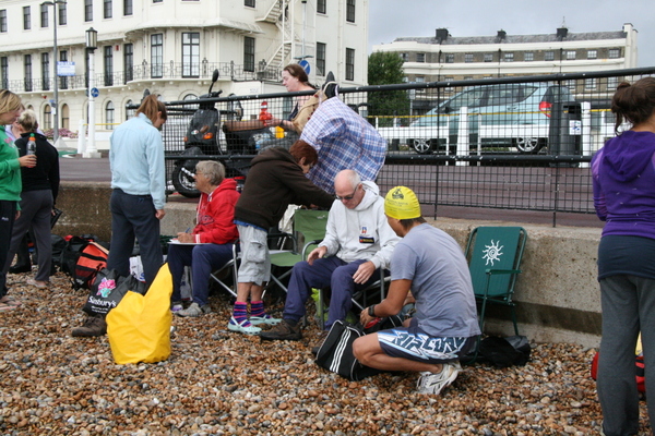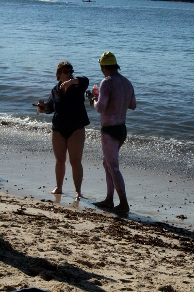 来了一群老头老太太。是一群志愿者,他们在此登记下海练习游泳者姓名、下海时间、来往趟数、上岸时间,确保每人都安全上岸,才离开。他们知道每一个横渡过的和准备横渡的“泳士”的情况。为大家传播消息和经验。他们还代买代卖横渡的食物、荧光棒和一切横渡时需要的物件。不盈利。