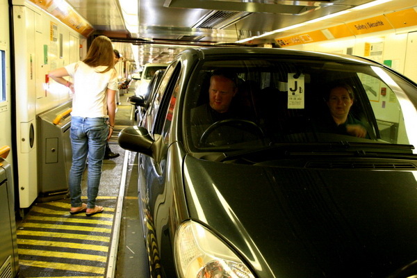 本以为车子直接开过隧道,原来车子要由火车载过去。就是这样的火车。 汽车上了火车,一节车厢容纳六辆小车,前后门就关上了。小车一定要熄火,泊车档,拉手刹。