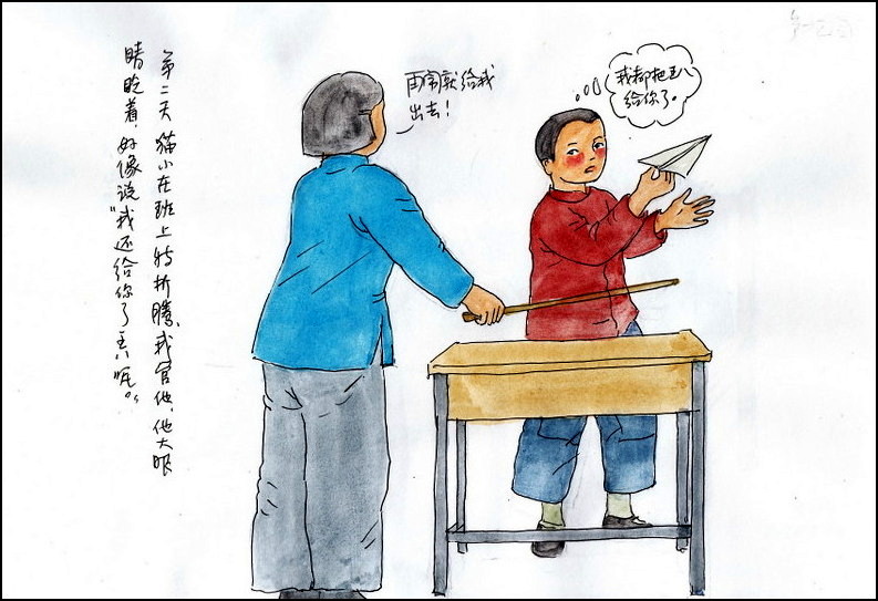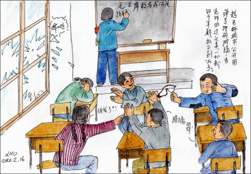 学生的心已经被文革初期的轰轰烈烈的造反行动弄得野性难收,想尽了坏招子捣乱。几乎所有教室窗户是玻璃都没有了,刚刚安好新玻璃,就会听到“哐啷”一声玻璃打碎的声音,然后就是一阵欢呼“玻璃翠(一种在六十年代风行的家庭栽培植物)!”(图中女孩说“你发了”是郊区农村骂人的话)