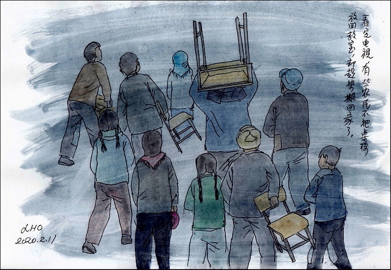 电视演完了,就有人摸黑顺手牵羊搬走了学生的桌椅,顺走老师们的饭碗、勺子。我的一个精致的银勺就被他们偷走了。