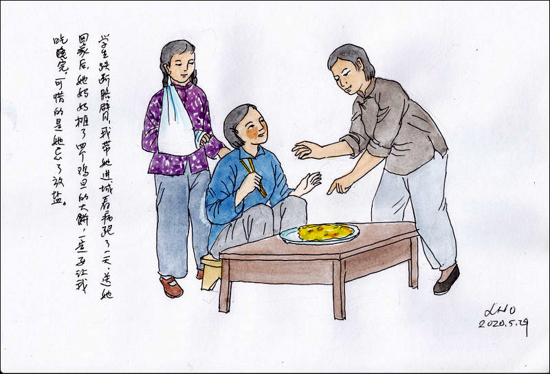 我对孩子们非常关心,一个学生在班上不断地咳嗽,我给了他一瓶咳嗽药,吃后见好。一个学生劳动时耳部被另一个学生用铁锹无意砍伤,我马上骑车带他上卫生院,自己掏钱给他看病,处理后又把他送回家。一个孩子坐二等车,在学校门前坑洼不平的路上摔下去,胳臂脱臼。我立刻带她去村里土医生处正骨归位,为了保险又带她去积水潭医院照片子,发现还有骨裂,打了石膏,然后把学生送回家,花了整整一天时间。学生妈妈千恩万谢,打了四个鸡蛋摊了一个大鸡蛋饼,一定要我吃完再走。鸡蛋饼忘了放盐,难以下咽,我又不好意思说,勉强吃完。