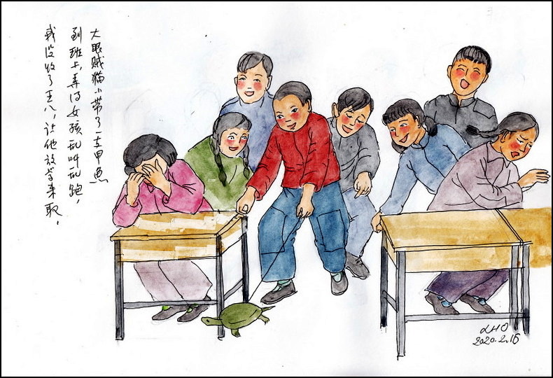 在学校工作十年,我收的礼就是那两块白薯。但是也有个别以权谋私的“事件”,一件是前面说过的抽了两根没收的“战斗”烟。另一件是一个甲鱼。有一个小闹将毛小一天上学带来一个甲鱼,俗称王八,拴着它在教室里乱走,所到之处引起一片喧哗。我凶神恶煞地没收了王八,叫他放学后到我宿舍来领。