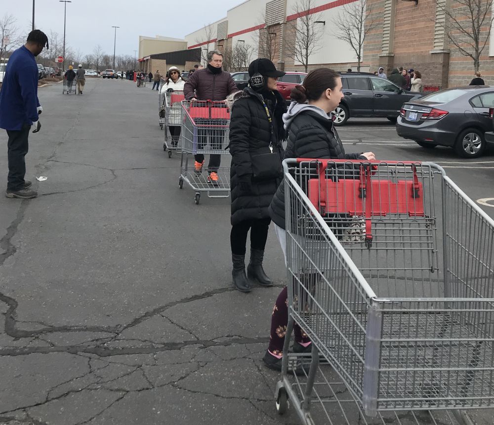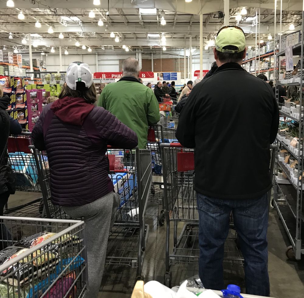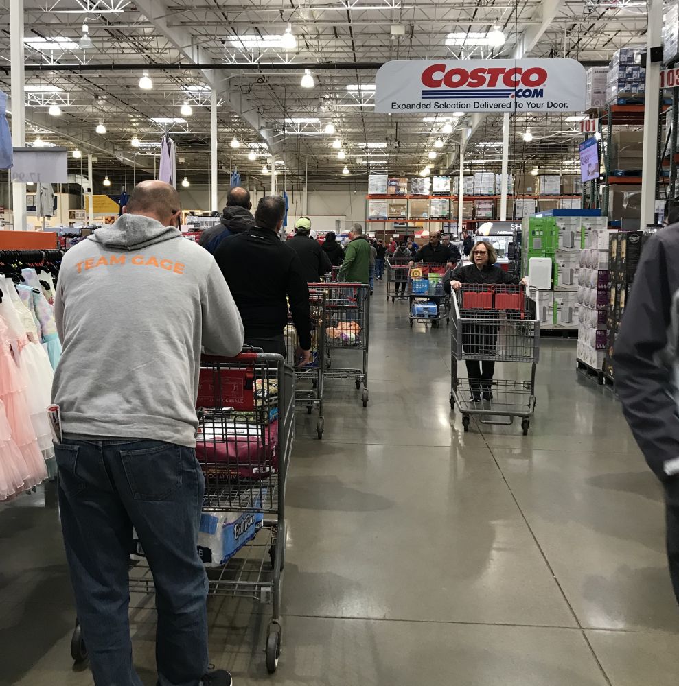 Costco的服务人员向排队的人们大声讲着: 开门后不要拥挤, 依次进入。 没有水, 没有鸡蛋,没有paper towel, 不要往后面放水的地方去, 直接向你想要的东西的地方去。