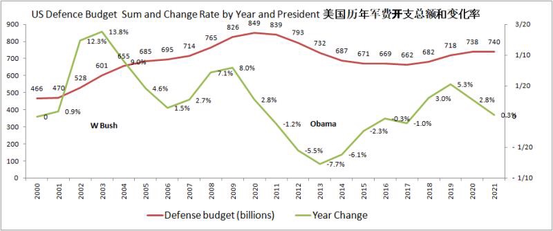 以下统计数据显示了美国自2000年来,经历三任总统的军费开支变化。经费开支由小布什的就任初期的4600亿,因反恐战争和两伊战争的需要,一直不断攀升增加到奥巴马时期的近8500亿。在奥巴马执政的后五年中,军费开支一路回落到了6700亿左右。特朗普上台后第二年,就把经费提到了7000亿以上,在2021财政年度中,特朗普政府提交的经费开支是7400亿。