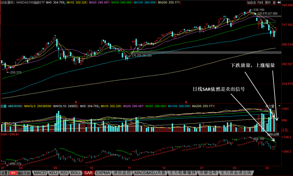 今天QQQ是大盘的领涨板块,涨幅不小。现在到底是破底翻还是死猫跳呢?