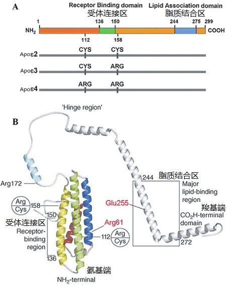 早在1982年Rall等人就已告知 ApoE 由299个氨基酸组成。ApoE的氨基酸链中第112和158号的氨基酸会不一样。三个主要等位基因(ε2,ε3和ε4)是:Apo-ε2(cys112,cys158),Apo-ε3(cys112,arg158)和Apo-ε4(arg112) ,arg158)。其中cys是半胱氨酸,arg是精氨酸。这些差异改变了Apo E的结构和功能。
