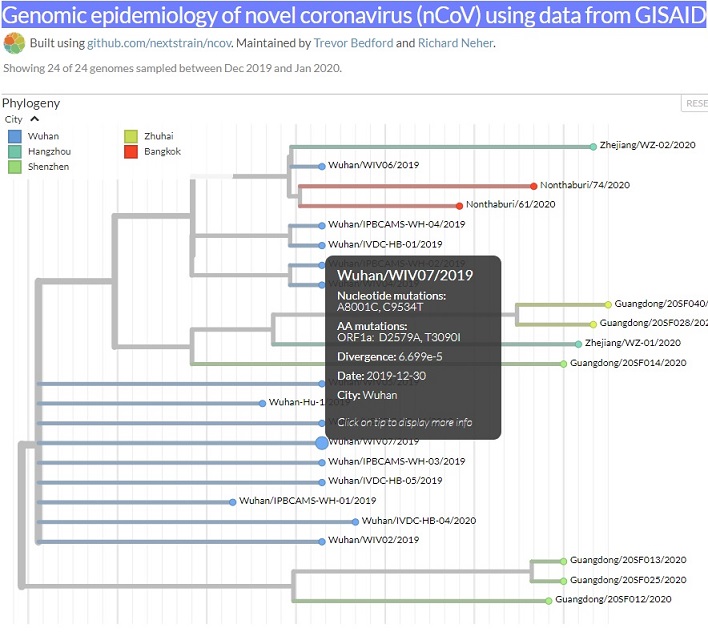 许多人关心新病毒的基因突变,可以到这个网站看看:https://nextstrain.org/ncov?m=num_date。这是使用来自GISAID(截止到写稿时)的数据绘制的的新型冠状病毒(nCoV)的基因组流行病学树。将鼠标移到一个端点上,就可以看到这个基因序列中哪里发生了突变。只可惜两个相邻的端点是不是有亲属关系?不知道。