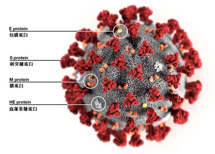 从外表可以看到是 S 刺突糖蛋白、E 包膜蛋白、M 膜蛋白和灰色的病毒外套膜(Envelope)。由于新病毒 SARS-CoV-2 不包含血凝素糖蛋白(HE protein),所以美国 CDC 网站现已做修改,维基的网页还没修改。