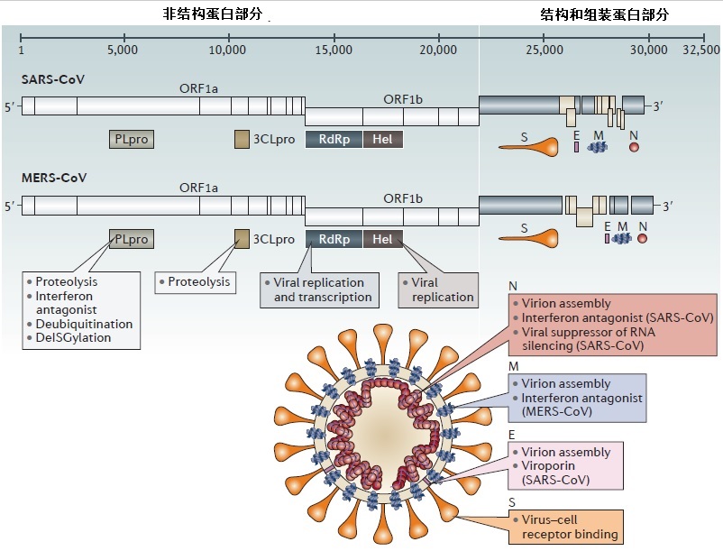 第一部分:非结构蛋白,由 ORF1a 和 ORF1b 组成。这一大段又分成了16小段:nsp1 - nsp16,每一小段分工不同、长短不一。上海科技大学饶子和/杨海涛课题组已经测定了第5小段 - nsp5 即3C样蛋白酶(3CLpro) 的高分率晶体结构,这是抗病毒药物的重要靶点。第2小段 - nsp2 中的木瓜蛋白酶样蛋白酶(PLpro)也是抗病毒药物的靶点。第12小段 - nsp12 即RNA依赖的RNA聚合酶(RdRp)对于RNA病毒的复制至关重要,并且代表重要的药物靶点。瑞德西韦(Remdesivir)就是一种组成病毒 RNA 核苷的类似物,可抑制新冠状病毒的 RdRp,从而抑制了病毒的复制。